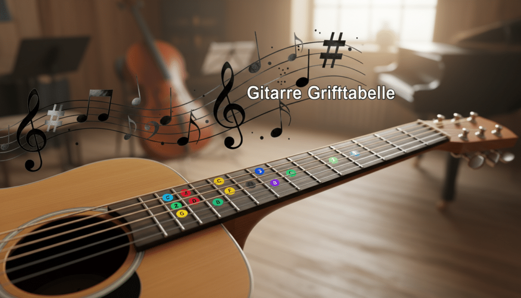 Die Grifftabelle zeigt dir übersichtlich, wo sich jeder einzelne Ton auf dem Gitarrenhals befindet. Sie ist wie eine Landkarte, die dir hilft, dich in der komplexen Welt der Töne und Intervalle zurechtzufinden. Mit ihrer Hilfe kannst du: